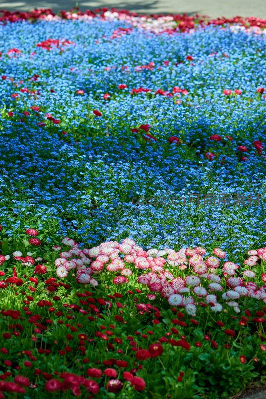 大片蓝色勿忘我与粉红雏菊交相辉映,形成梦幻般的彩色地毯,展现人工园林设计的精致与自然之美融合。