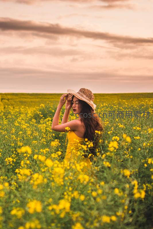 一位身着黄色连衣裙的女子站在无边的油菜花田中,夕阳余晖洒满全身,她轻扶草帽回眸凝望,画面宁静而充满诗意。