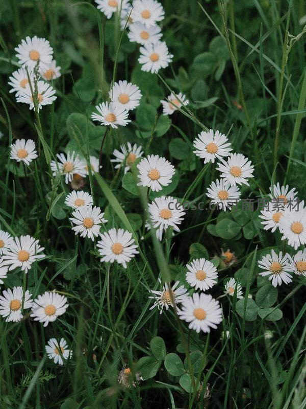 洁白的雏菊在翠绿草丛中星星点点盛开,花瓣细腻,花心金黄,微风轻拂下随风摇曳,展现出自然最纯净的生机与活力。