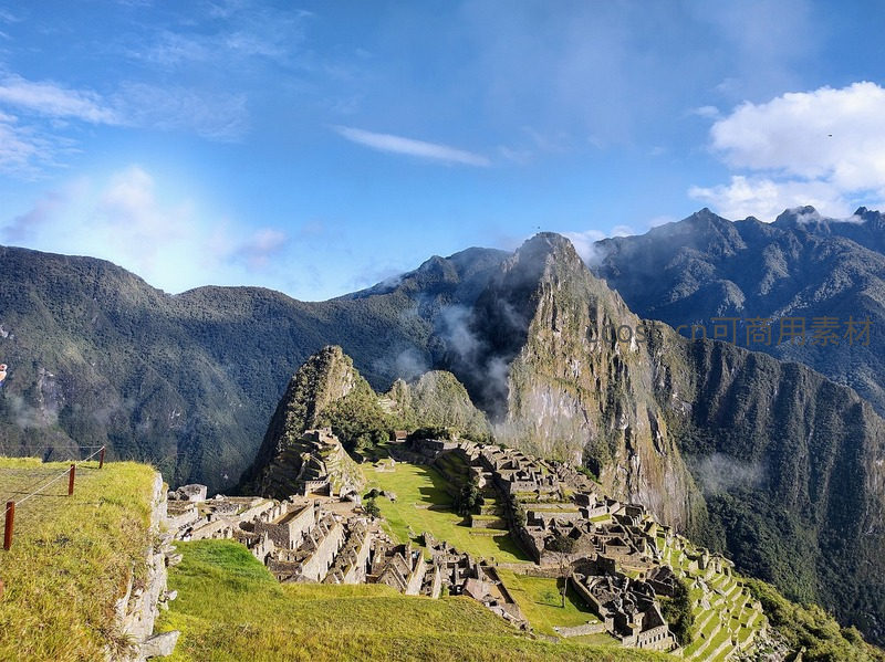 古老的印加遗址马丘比丘依山而建,在蓝天白云和缭绕云雾的衬托下,展现出其雄伟与神秘的历史魅力。