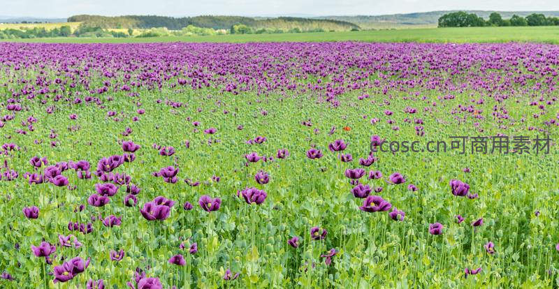 紫色罂粟花在碧绿田野中竞相开放,形成梦幻般的紫色海洋,远山为幕,微风送香,令人沉醉于这宁静又绚烂的田园风光。