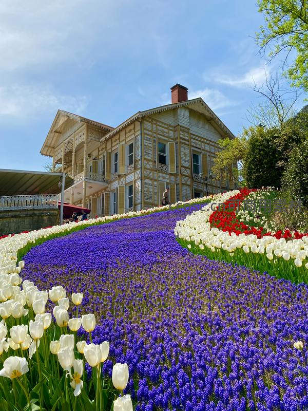 一座精美的复古木屋被五彩斑斓的花海温柔环抱,紫色风信子与白色、红色郁金香交织成画,蓝天白云下尽显春日浪漫与宁静。