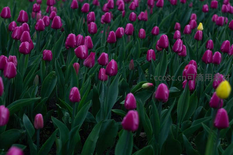 大片深紫色郁金香整齐排列于翠绿叶丛间,偶有几朵明黄点缀其中,营造出沉静优雅又不失活力的视觉效果,宛如大地的调色盘。