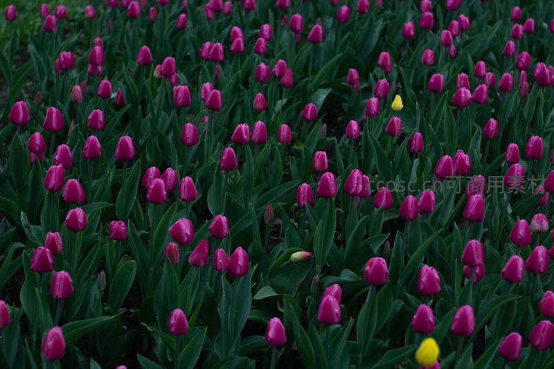 黄昏时分,紫红色郁金香在渐暗天光下更显深邃迷人,零星黄色花朵如点睛之笔,整个画面弥漫着静谧、温柔且略带神秘的氛围。