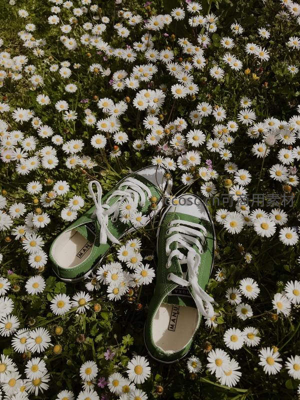 一双绿色帆布鞋被放置在盛开的白色雏菊花丛中,阳光洒落,营造出一种充满青春活力与自然气息的悠闲氛围。