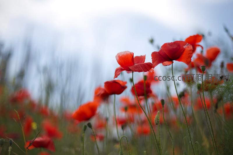 几朵鲜红的虞美人花在微风中轻轻摇曳,背景是模糊的花海与天空,画面充满动感与诗意,展现了野花的自然之美。