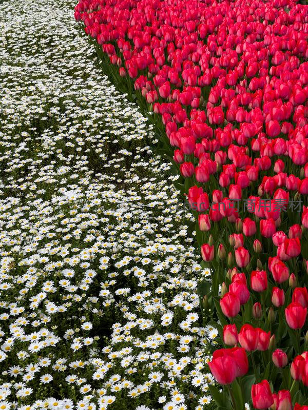 鲜艳的红色郁金香与纯净的白色雏菊在花圃中形成鲜明对比,如同大自然挥洒的颜料,勾勒出充满活力与美感的艺术化景观。