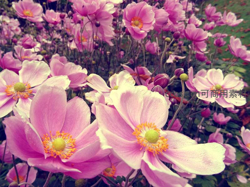 粉嫩的秋牡丹在晨光中盛放,花瓣轻盈如纱,中心橙黄色花蕊点缀其间,叶尖还挂着晶莹露珠,整体画面充满温柔浪漫的春日气息。