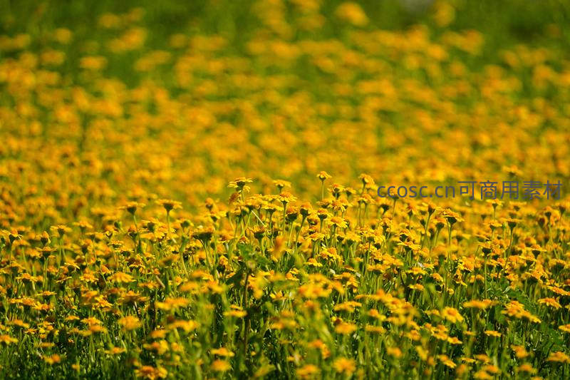 广角镜头捕捉到一片无垠的黄色野菊花田,花朵密集,绿叶点缀,阳光照射下金光闪闪,远处渐变模糊,充满温暖与活力。