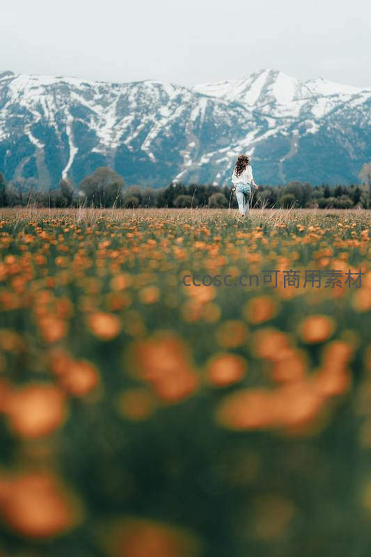 一位女子背对镜头,行走在开满橙色野花的草原上,远处连绵的雪山巍峨耸立,构成一幅宁静而壮阔的自然画卷。