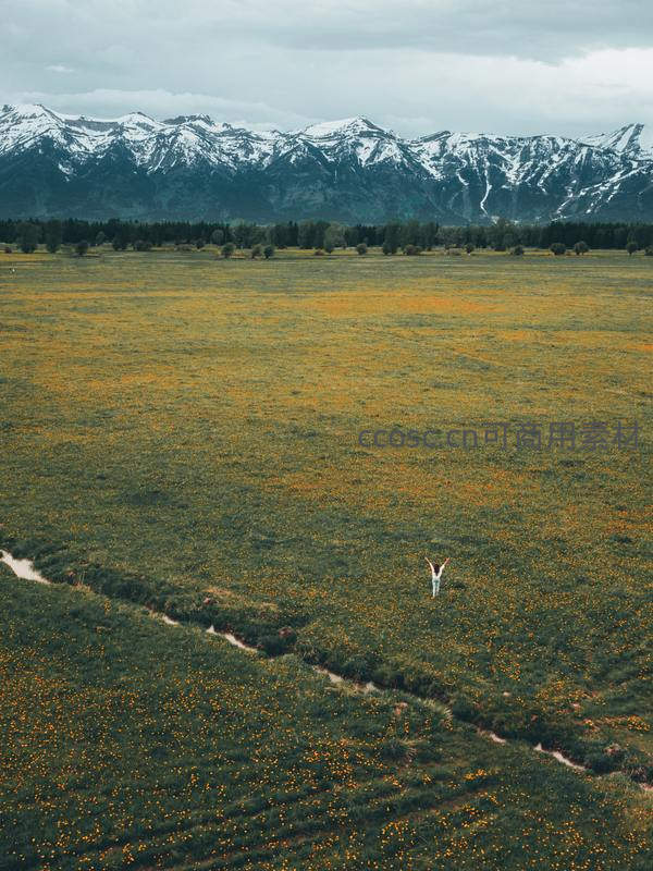 从高空俯瞰,无垠的黄色花海延伸至雪山脚下,渺小的人影张开双臂融入其中,尽显人与自然和谐共处的震撼之美。