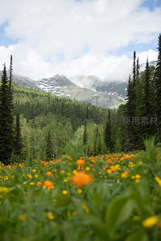 一片橙黄色的野花在山谷中热烈绽放,背景是苍翠的针叶林与白雪覆盖的巍峨山峰,蓝天白云下尽显高山生态系统的原始与壮美。