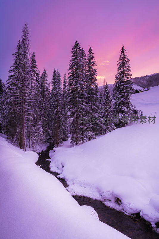 粉紫色的晚霞染红天际,覆盖着厚厚积雪的松树林间,一条小溪静静流淌,整个画面如童话世界般梦幻唯美。
