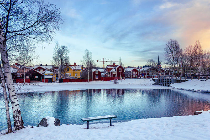 雪后初晴的湖畔小镇,彩色木屋倒映在清澈湖面,夕阳余晖染红天际,空荡长椅静立岸边,营造出童话般温暖宁静的北欧冬日风情。
