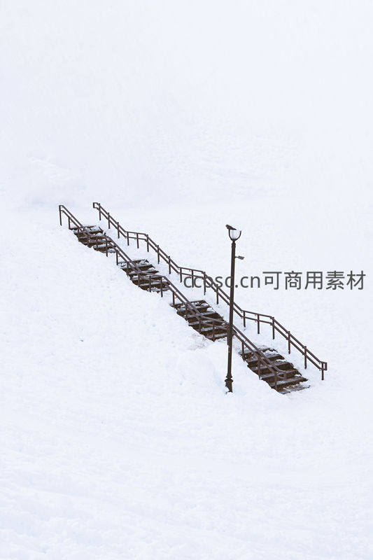 皑皑白雪覆盖大地,一条蜿蜒的阶梯在雪中若隐若现,一盏孤灯伫立路旁,一只小鸟停驻其上,构成一幅静谧而富有诗意的冬日画面。