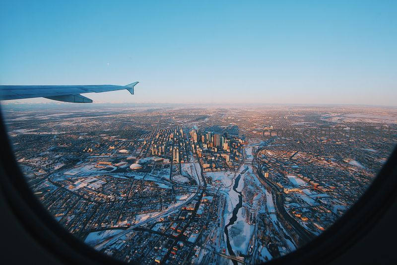 透过舷窗,机翼划过天际,下方是被白雪覆盖的城市全景。楼宇林立,河流蜿蜒,夕阳余晖洒在屋顶,万家灯火初上,展现出冬日都市的壮阔与温情。