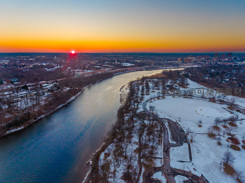 冬日河畔夕阳,雪地公园蜿蜒小径