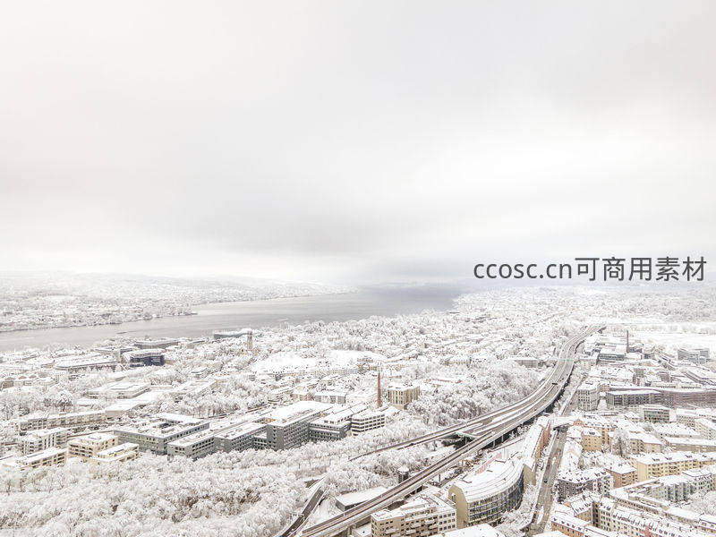 从高空俯瞰被皑皑白雪覆盖的城市,道路蜿蜒穿行于楼宇与森林之间,远处河流静谧,天空云层低垂,尽显冬日宁静之美。
