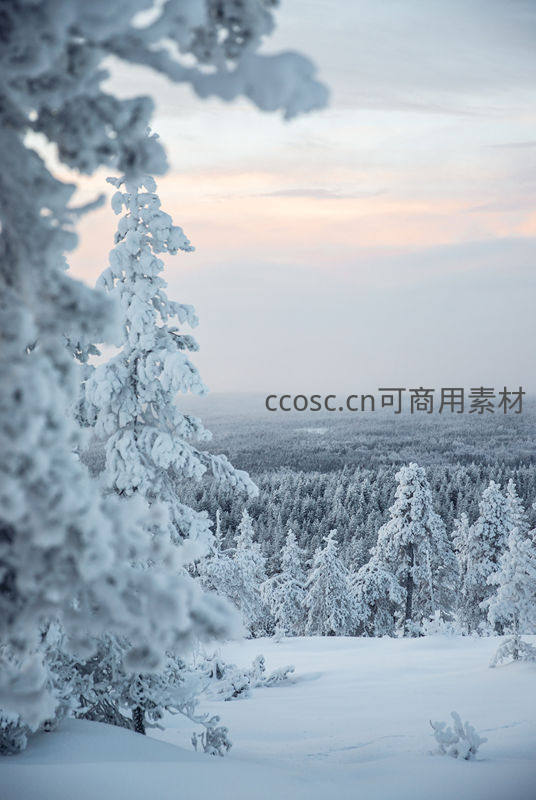 夕阳余晖洒在无边的雪林之上,枝头挂满冰霜,远处地平线朦胧,整个世界仿佛沉入宁静的冬日梦境。