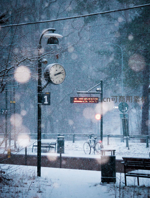 大雪纷飞的夜晚,街灯下的车站时钟静默伫立,红色电子屏闪烁着信息,一辆单车停在雪中,营造出宁静而略带孤寂的城市冬日氛围。