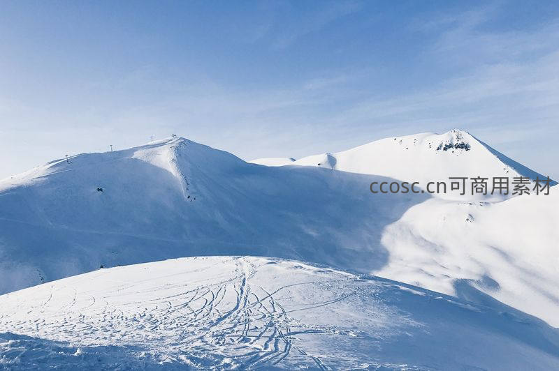 连绵起伏的雪山之巅,清晰可见的滑雪道如丝带般蜿蜒,远处缆车缓缓移动,展现冬季运动的壮阔与活力。