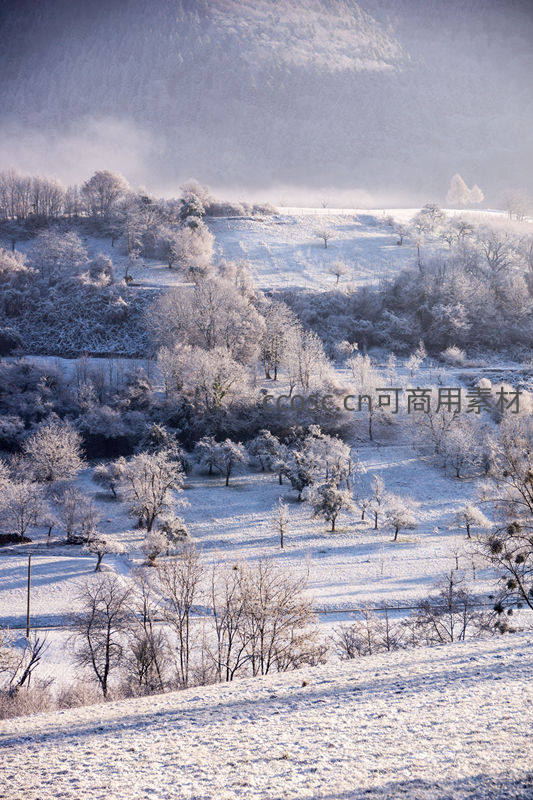 薄雾轻笼着被白雪覆盖的树林与山谷,阳光穿透雾气洒下斑驳光影,整个场景宛如仙境,宁静而梦幻。