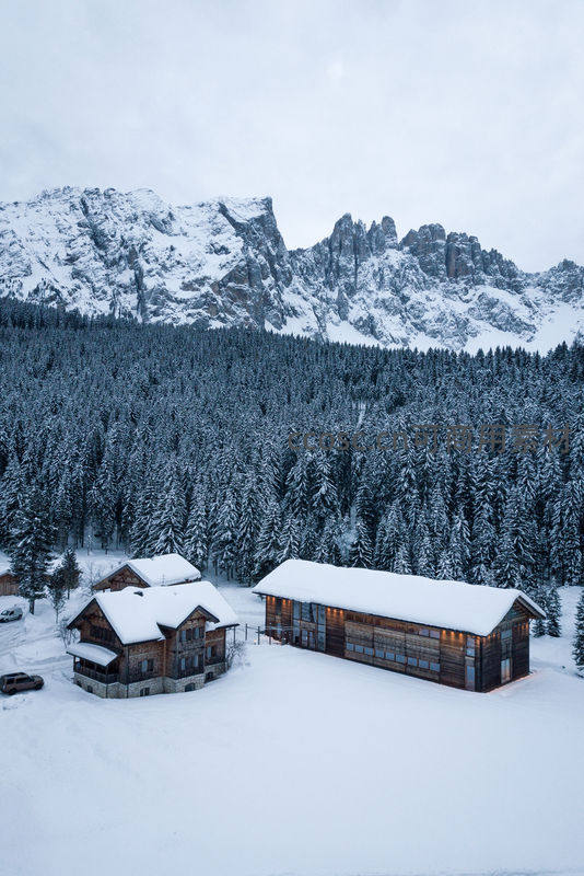 皑皑白雪覆盖山峦与松林,几座温暖木屋静卧其间,远处峭壁巍峨,近处炊烟袅袅,构成一幅纯净而安详的冬日画卷。