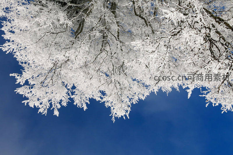 仰拍视角下,树枝上凝结着厚厚的白色雾凇,每一根枝条都晶莹剔透,在纯净的蓝色天空背景下,宛如童话世界中的水晶树冠。
