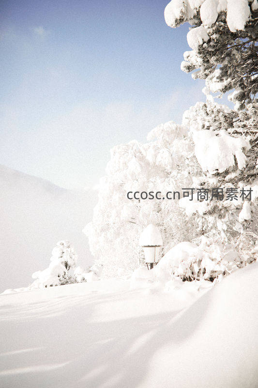 皑皑白雪覆盖了整片松林与山坡,一盏造型古典的路灯伫立在雪中,远处山峦朦胧,阳光洒下,营造出一片纯净而安宁的冬日仙境。