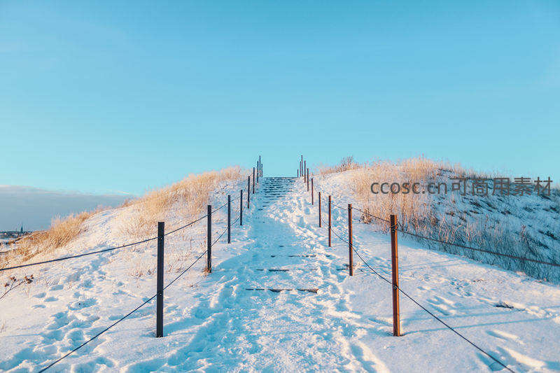 一条被白雪覆盖的阶梯蜿蜒向上,两侧是简单的围栏和枯黄的草丛,在晴朗的蓝天下延伸至远方,仿佛通往一个纯净无瑕的冬日秘境。