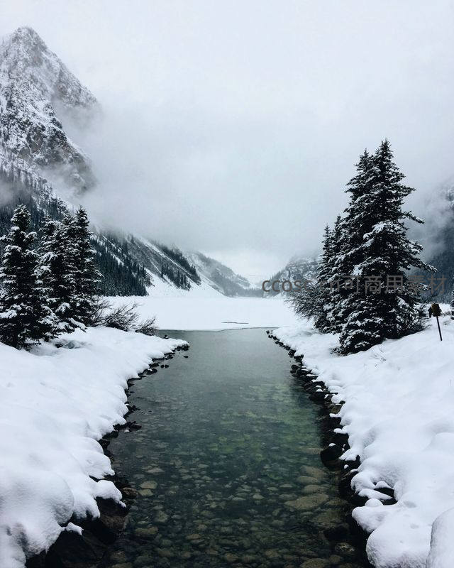 皑皑白雪覆盖着巍峨群山与幽静湖泊,松林挺立两岸,薄雾缭绕峰顶,一条清澈溪流蜿蜒入湖,尽显冬日自然的纯净与壮美。