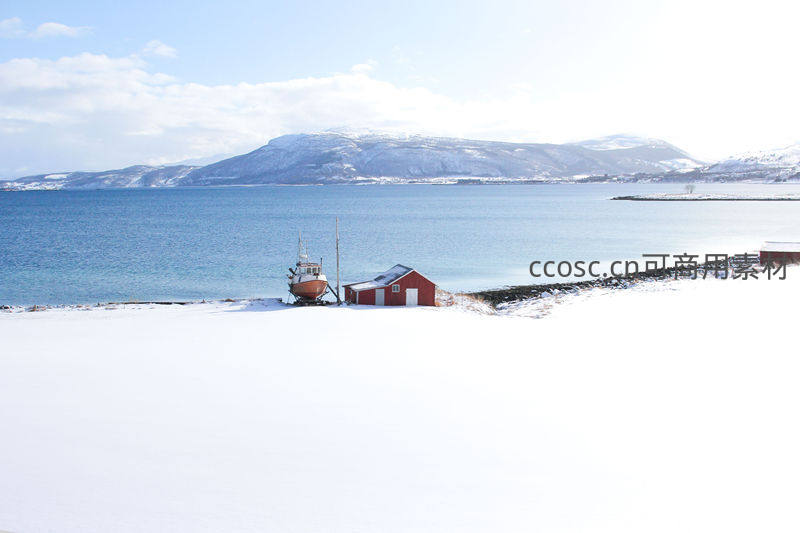 广袤雪原延伸至湛蓝海岸,一座鲜红小屋静立岸边,旁停旧船,远山如黛倒映水中,冷暖色调交织,营造出北欧风格的诗意冬日海岸。