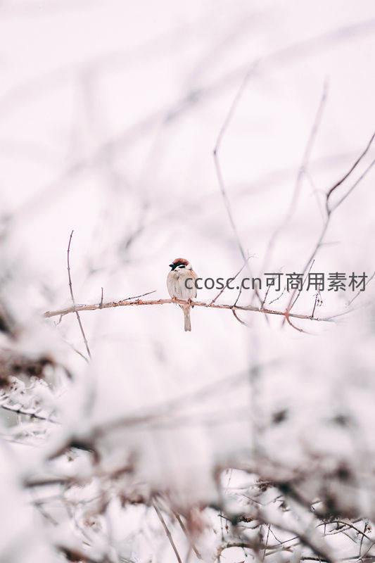 一只麻雀静静伫立在覆雪枯枝上,背景是朦胧的白色雪幕,它小巧的身影与萧瑟枝条形成对比,传递出寒冬里生命的坚韧与孤独之美。