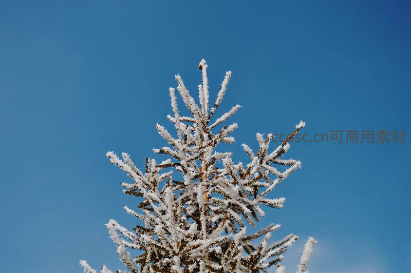 微距镜头下,覆满霜花的松枝在湛蓝天空的映衬下晶莹剔透,宛如天然雕琢的艺术品,展现冬日自然的细腻与冷冽之美。