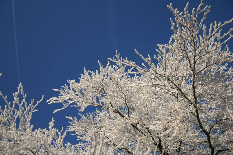 仰拍视角下,满树雾凇在深蓝天空背景下熠熠生辉,每根枝条都裹着洁白冰晶,营造出童话般的冬日仙境氛围。