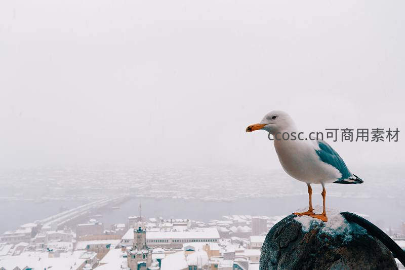 一只海鸥立于覆雪的岩石之上,俯瞰着被大雪笼罩的城市全景,背景是朦胧的楼宇与河流,展现人与自然在寒冬中的和谐共存。