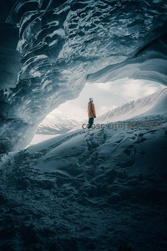一人伫立冰洞入口,凝望远方雪峰,晶莹剔透的冰壁与幽蓝光影交织,展现大自然鬼斧神工的壮丽景象。