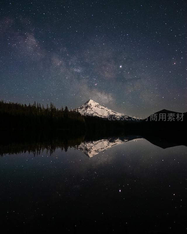璀璨银河横跨夜空,白雪覆盖的山峰倒映在平静湖面,松林剪影勾勒出梦幻般的自然奇观。