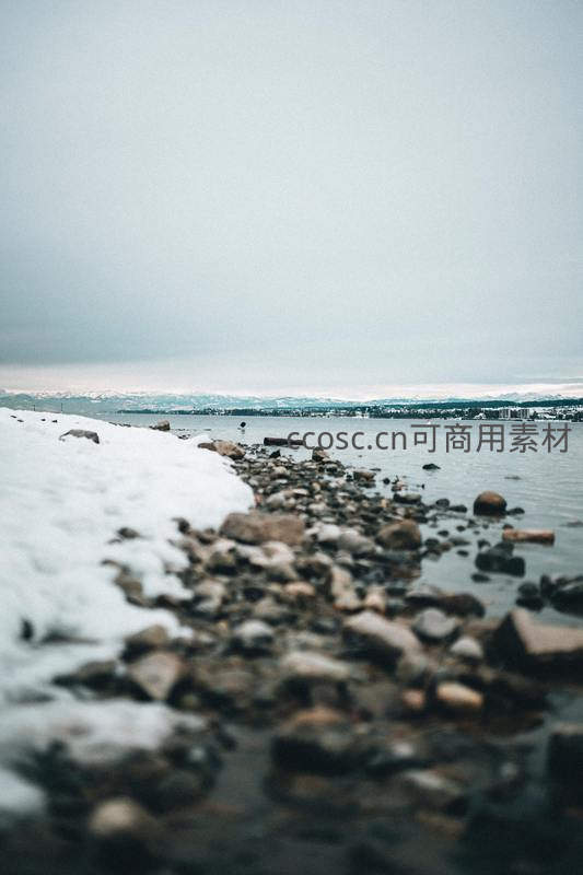 近处积雪覆盖的石滩延伸至水边,远方隐约可见城市建筑与雪山轮廓,营造出寒冷季节的辽阔与孤寂感。