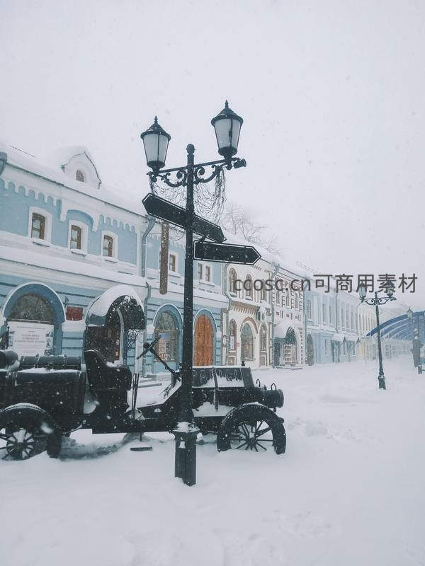 鹅毛大雪飘落,将一条充满欧洲古典风情的街道温柔覆盖。复古马车停在路旁,彩色建筑在雪中更显雅致,营造出童话般的冬日氛围。