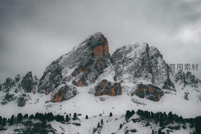 厚重的阴云低垂,覆盖着被白雪点缀的嶙峋山峰,裸露的岩壁透出赭红色调,展现出一种肃穆而原始的高山地貌之美。