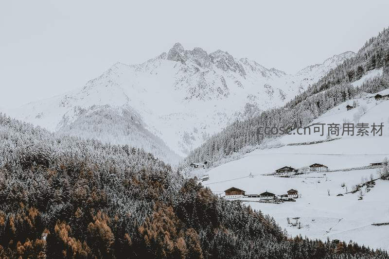 连绵的雪山环抱着宁静的山谷村落,房屋错落有致地散布在雪原之上,四周松林与落叶林交织,营造出冬日里安详祥和的田园意境。