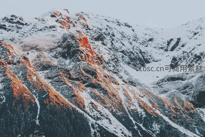 落日余晖温柔地洒在积雪覆盖的陡峭山脊上,将岩石染成温暖的橙金色,明暗对比强烈,呈现出大自然鬼斧神工般的壮丽光影效果。