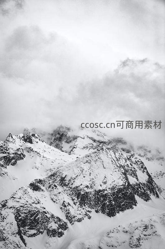 黑白影像中的雪山巍峨耸立,厚重云层环绕山巅,岩石纹理与积雪对比强烈,营造出宁静而神秘的水墨意境。