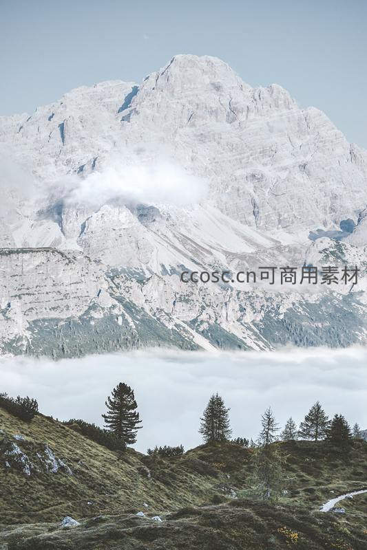 高耸入云的雪峰被薄雾环绕,山腰绿草如茵,几棵孤松点缀其间,展现出大自然的壮丽与宁静。