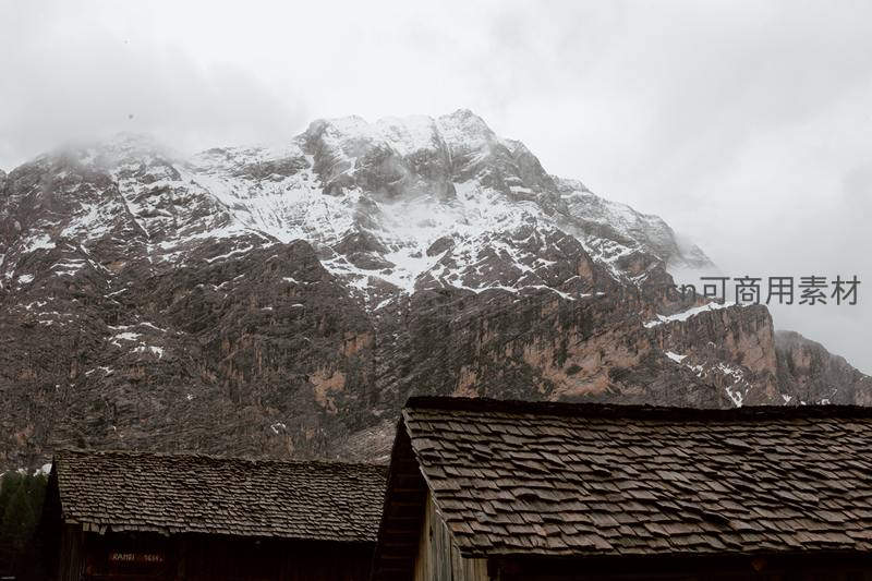 前景传统木屋瓦顶勾勒出质朴线条,背景是雄伟险峻、部分覆雪的嶙峋山岩,云雾缭绕间尽显高山村落的原始与壮美。