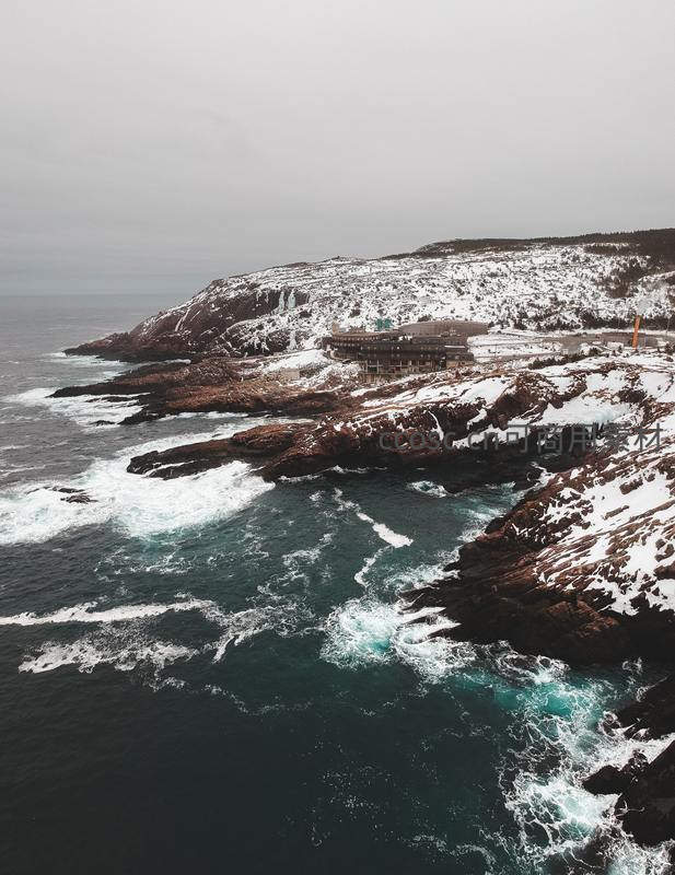 白雪覆盖的崎岖海岸线上,深色礁石与翻腾白浪激烈碰撞,远处建筑点缀其间,构成一幅冷峻而充满动感的画面。