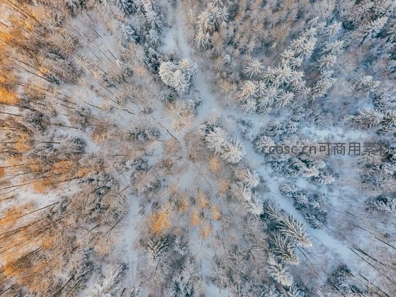 从高空俯瞰,银装素裹的针叶林如大地铺展的白色绒毯,阳光为部分树冠镀上金边,呈现梦幻般的冬日童话景象。