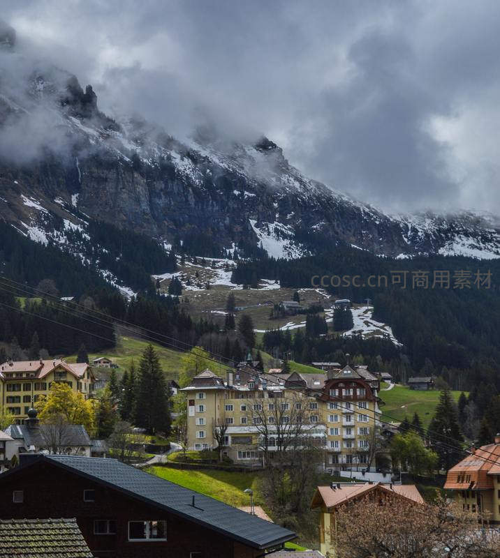 云雾缭绕的山间小镇,错落有致的房屋依山而建,远处雪山若隐若现,呈现出宁静祥和又富有层次感的山居生活图景。