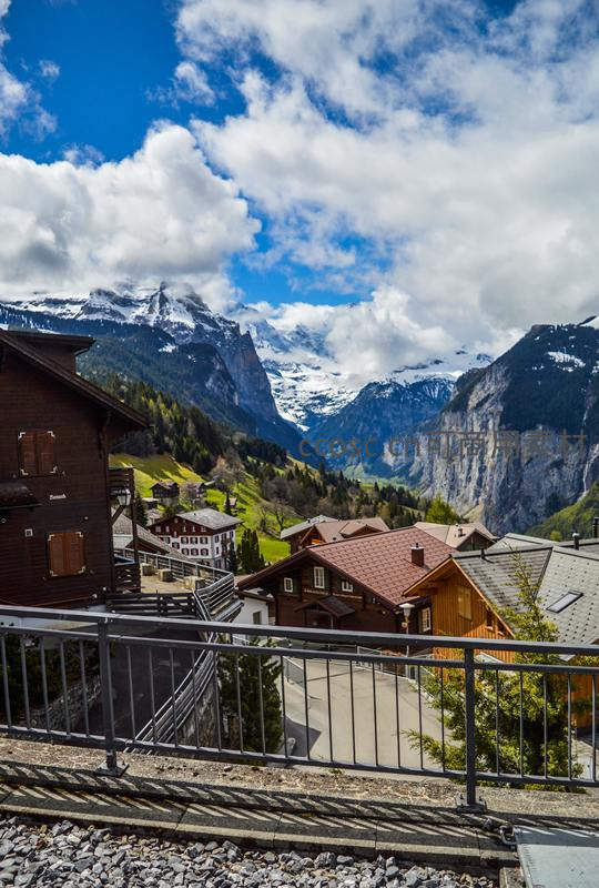 阿尔卑斯山脚下,传统木屋错落有致,远处雪峰巍峨,云雾缭绕,近处铁轨延伸,构成一幅宁静壮丽的自然与人文画卷。